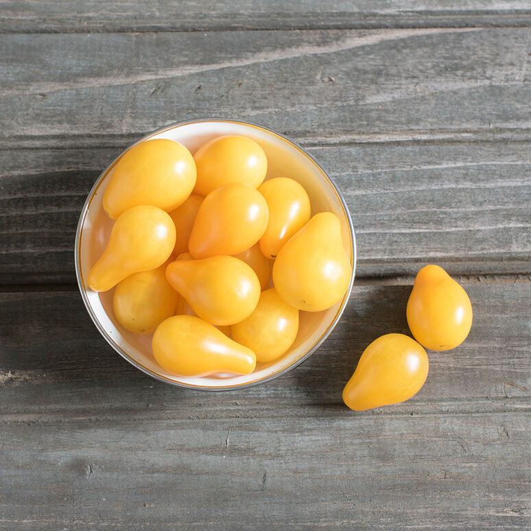 The tall, vigorous vines bear quantities of small, 3/4–1 oz., lemon yellow, pear-shaped fruits. Mild flavor. Indeterminate.
